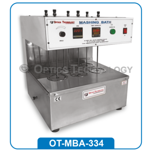 Is used in the processing of mashing grains from 45° to 72°C. Converting into sugar from enzymatic reaction “Optics Technology” mashing bath is designed according to the hartong and congress procedure with availability of 6 Jars with 6-Stirrer and 1 rotation stirrer for water with digital temperature, RPM and timer displayed. Made up of complete S.S. Body with fixed motorized stirrer on top regulated by controller, provide with 6 Stirrer.