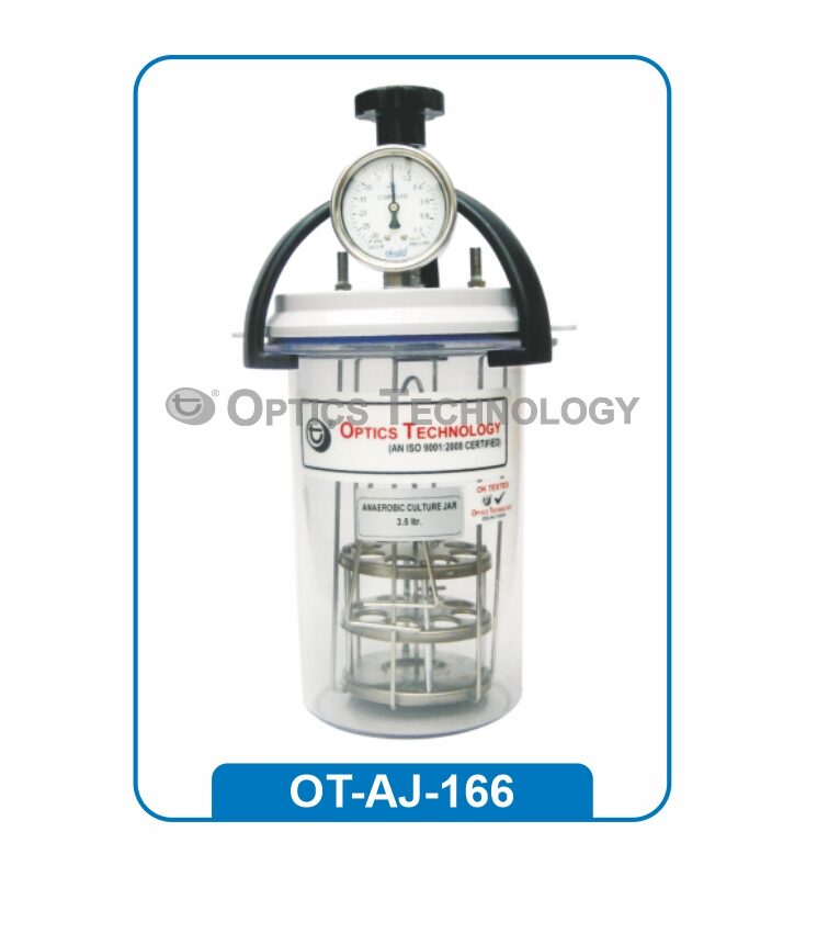 This is recommended only where inside condition air of jar is removed through vacuum pump and CO2 is filled in the jar through CO2 gas cylinder to generate anaerobic conducting in the jar. Transparent Anaerobic Culture Jar of 3.5 lit. capacity made of Polycarbonate. The lid of the jar is made of Aluminium Pressure die casting fitted with Pressure valve, Vacuum valve, Safety valve & Compound Pressure cum vaccum gauge, three finger aluminium clamp and sealing “O” ring and Air / Gas chuck. Supplied with: Petri Plate Carrier - Stainless steel for 10 petri Dishes. Test Tube Carrier - Stainless Steel.