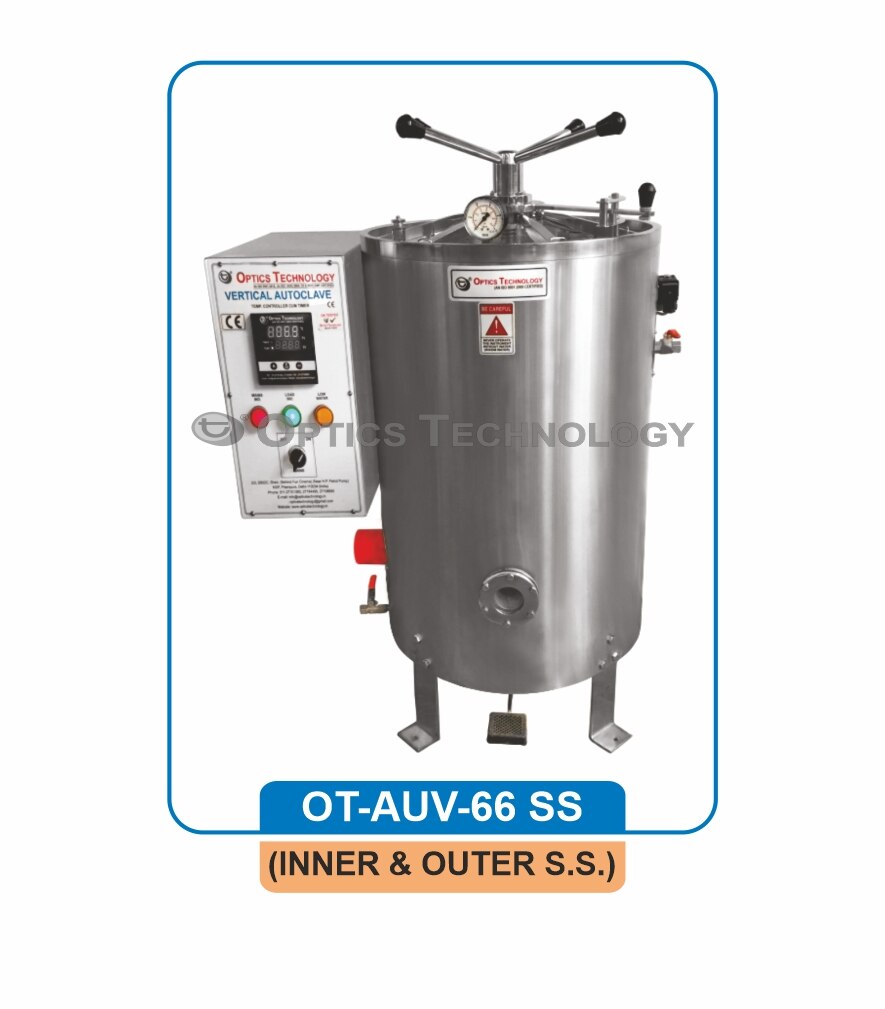nner chamber is made of thick Stainless Steel (304). Outer body is made of thick Mild Steel / Stainless Steel 304. The chamber is absolutely leak proof and can be operated at any Selected point in between 5 to 20 pounds per sq. Inch. It is provided with pressure gauge, pressure release valve, S.S. Basket, safety valve, water level indicator with cord, Plug & Pressure Control Switch. It is provided with Radial Locking System with Automatic Water Level cut off device for element as a safety feature and Digital Temp. Controller Cum Timer. Temperature Range 121ºC ptional: Vacuum Breaker Valve Calibration Port Safety Alarm Specially designed Lid locking system to make sure lid is locked properly Single channel data logger system (Only with Automatic Model) Printing System with Thermal Printer 21 CFR Software Automatic System (Only for Normal Autoclave Vertical Model) OR Microprocessor Based Automatic Touch Screen Display System with Data Logging
