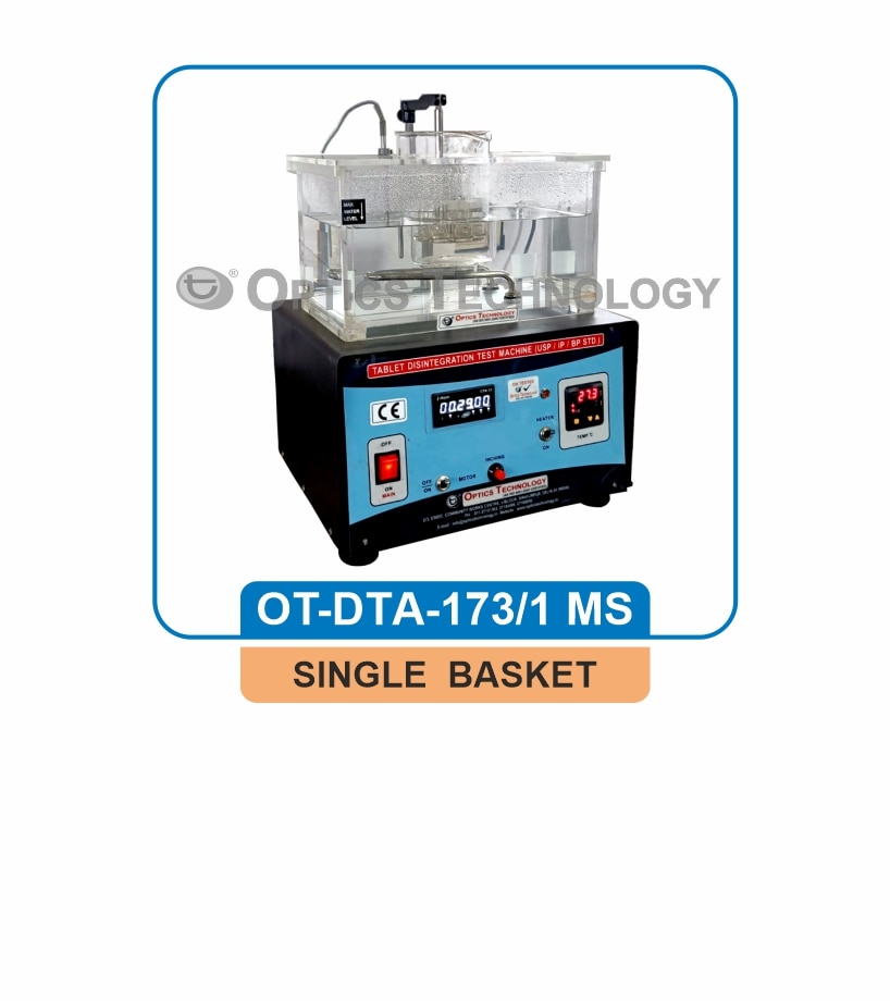 The instrument is designed for accurate estimation of disintegration time of tablets/capsules. It is assembled in painted sheet metal cabinet with chemical resistant epoxy coating, fitted with superior quality constant speed sturdy motor. The guide discs and strokes are confirming to Pharmacopoeia Standards. (Body is made of M.S. Duly Powder Coated / SS 304 Body). Specifications: Displacement : 55mm RPM : 30 Drive : 1/8 HP Heater : 125 watt. Power : 230 V AC Single Phase Optional: Digital Time Totalizer Water bath System Instead of Hot Plate with Thermostatics Temperature Controller Microprocessor Based PID Controller (Only with Water bath model).