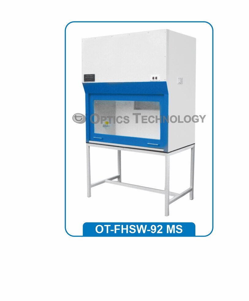 Laboratory fume hoods are one of the most important components used to protect laboratory personnel from exposure to hazardous chemicals and agents used in the laboratory. Cabinet is made of : Wooden Body / M.S. Duly Powder Coated / Stainless Steel (304). Interiors acid resistant material coated with fire proof epoxy paint & further fixed on storage cabinet. Working table is covered with Granite Front door is made of 6mm clear Toughened glass. Counter weight balance Front Door. Vertical sliding facility & the front door can be stopped at any point. Exhaust blower consists of single phase motor connected with a PVC Exhaust Ducting. Standard ducting upto 6’ is provided. OR ANY NON STANDARD SIZE. Optional: Base Storage Cabinet P.P. Sink with Swan Neck Water Tap Air flow monitor (LCD Display) Automatic Motorized front door lifting arrangement Touch Screen Display with Air Flow Monitor Scrubber System
