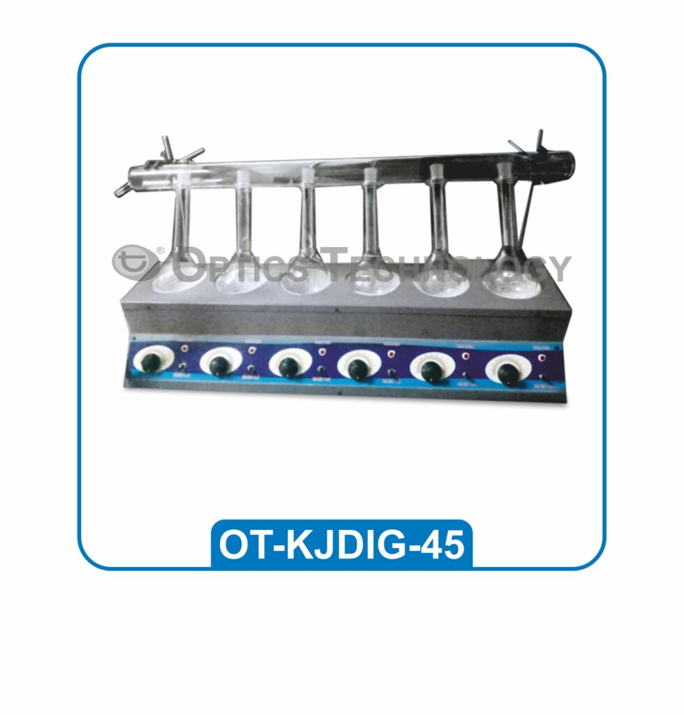 The digestion units are provided a condensing tap with individual condensing taps. They are placed on a MS angle stand with their respective controls supplied with/without any glass parts. Works on 220V mains Supply. It is used to determine organic nitrogen (N2) content in the substance. Mantle with heater assemblies are recessed into the top insulating board to minimize accidental personnel contact with a hot heater element Digestion unit cabinet is made of M.S. Body duly powder coated. The top is made of 3 Test / 6 Test thick insulating board which protects wiring and controls from heat, ensuring longer life.