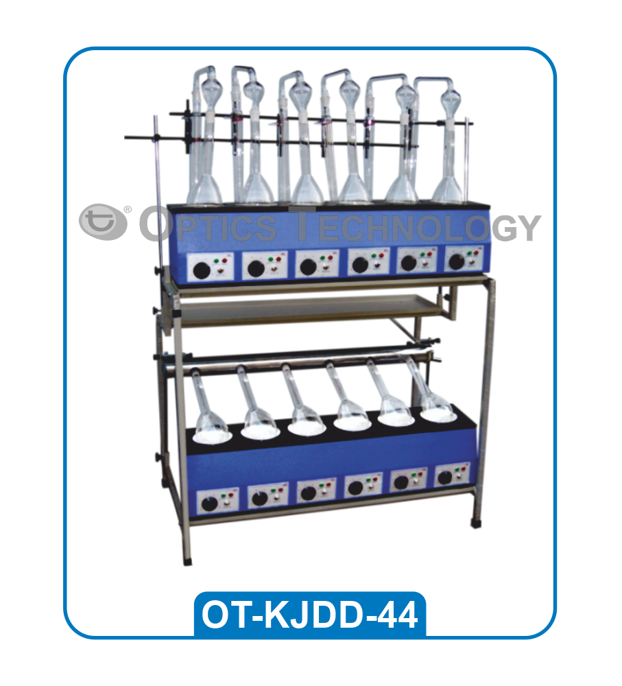“Optics Technology” offers digestion and distillation combined unit. A maximum of 6 mantles which are made of a knitted layer of glass fabric combined with flexible heating elements, encased in mild steel housing. Temperature ranges from ambient to 350ºC controlled by Sunvic energy regulator with either a single control or individual controls, with corresponding indicating lamps. The distillation units are provided with a fume duct, which is held by clamps (provided with the unit) suspended on a stand having mobility for both horizontal and vertical movements. The digestion units are provided with the above features along with a condensing tank with individual condensing taps. They are placed on a MS angle stand with their respective controls supplied with / without any glass parts. Works on 220V Mains supply.