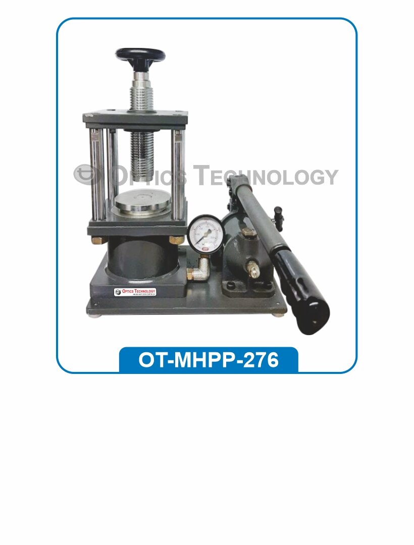 “Optics Technology” manually operated Hydraulic Pallet Press for fast and easy preparation of both solid and highly permeable pellet. Working: The pressure pallet and die arm are located in inner cylinder sample is placed in between polished pressure plates. A Hydraulic Press is then used to apply necessary pressure to the sample via die. Cylinder Type : Single acting, up stroking Weight : 35 kgs Pump Type : Hand Operated Safety Feature : Pressure relief valve to safeguard against applying over-pressure Model Size OT-MHPP-276/10 10mm KBr Die Set (Stainless Steel) OT-MHPP-276/13 13mm KBr Die Set (Stainless Steel)