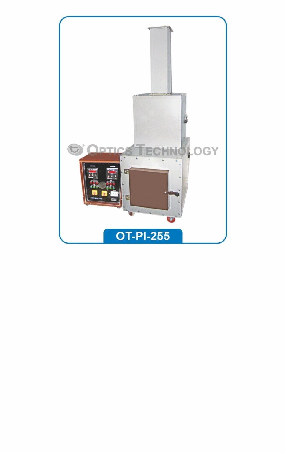 Incinerator is precisely designed for quick and safe disposal of waste materials specially for pharmacy colleges, small R&D labs, small nursing homes, veterinary colleges without causing any harm to the environment in a very eco-friendly process. CONSTRUCTION : Body is made of mild steel duly powder coated. Heating element is made of Kanthal wire. Ducting unit is also provided with this instrument, with water circulation in the lower chamber and burning portion in the upper chamber. Rating of heater : Lower chamber 12 KW, Temperature range 850ºC – 900ºC Upper chamber 4.5 KW, Temperature range 1050ºC. Available in different models as per specification.