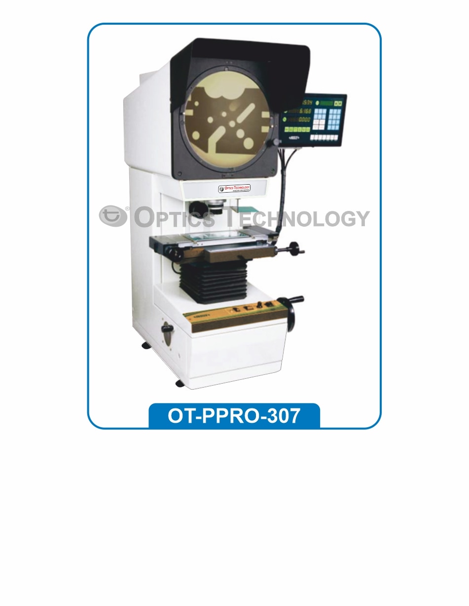 Is a device that applies the principles of optics to the inspection of manufactured parts. “Optics Technology” profile projector is manufactured using best material & leading techniques in compliance with the set norms of industry. Technical Details: Working table size : Al. 125 x 125mm Effective table area : 110 x 110mm X-Y Range : 25 x 25mm Measuring unit : Standard Micrometer Heads 0-25mm Resolution : 0.01mm Rotary Measuring Stage : 360° graduated with vernier 6 minutes. Stage Glass : Diameter 62mm Maximum Workpiece Height : 100mm Dimensions : 55 x 35 x 86 cms. Halogen Projection Bulb : 12Volts / 100Watt or 10watt Features: 1. High Accuracy 2. Reliability 3. Unmatched Quality