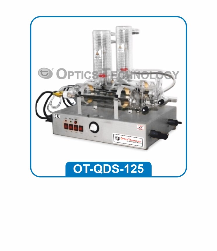 Quartz Double Distiller – with Replaceable Silica Heater and ripple Built-in Safety. “Optics Technology” unit consist of main boiler with a inbuilt heater enclosed in quartz glass tube with auto water lever adjuster and bottom outlet for cleaning waste discharged the whole unit is mounted on epoxy coated metal box stand with inbuilt power supply unit. Optional : Safety Control (Cut off Device)