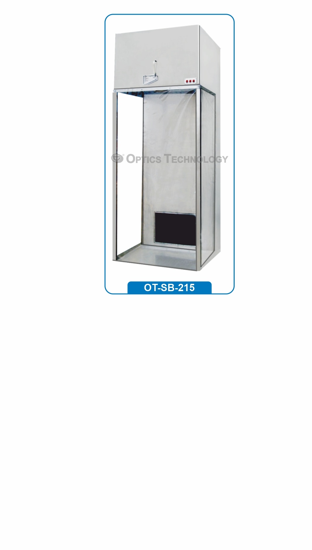 These are overhead clean air modules mounted with Stainless steel frame on the ground. Units can be built with / without casters so the clean enclosure can be moved over equipment or used to isolate a controlled process. It is basically used for filling, refilling weighing and sampling / Dispensing of Raw Material, Basic Compounds, Active Compounds. It works on the principal of Laminar Air Flow with HEPA Filters & Pre-Filters. This will act as a CLASS 100 Room. Protection of the personnel in the cabinet from the processed substances by vertical flow with Reverse Flow of clean air protection of the raw and intermediate products to be processed. Protection of the room where the cabinet is built up and environment from highly active substance which otherwise would disperse in the room and escape in the atmosphere unfiltered. Safe collection and deposition of substance released during work. Features: • M.S Powder Coated / Stainless Steel 304 Body • Hepa Filter (0.3 Micron) • Fine Filter (5 micron) • Pre-Filter (10 micron) at Arrestance 90% • Motor Blower Assembly • U.V. Light • Fluorescent Lamp Operating Switch • Static Pressure Manometer • Stainless Steel Standing Base • High quality HEPA filter provides protection for the product (filtration • efficiency of more than 99.97% at 0.3 micron). • Ultra-quiet noise level of not more than 65 dBA. • Durable and easy to clean stainless steel body. • Work area properly illuminated by diffused glare free fluorescent light. PVC Flexible Curtains on all the three sides. Specifications: Air Velocity : 90 ± 20 FPM (Average) Filtration Elements : Main Filters - HEPA Filter Prefilter : Washable non-woven polyester fibers. Light Intensity : 800-1000 Lux Power Supply : 220V Single Phase, 50 Hz. Model No. Working Size W x D x H OT-SB-215-MS/SS-A 2' X 2' X 6' OT-SB-215-MS/SS-B 3' X 2' X 6' OT-SB-215-MS/SS-C 3' X 3' X 6' OT-SB-215-MS/SS-D 4' X 2' X 6' OT-SB-215-MS/SS-E 4' X 3' X 6' OT-SB-215-MS/SS-G 6' X 4' X 6' OT-SB-215-MS/SS-H 6' X 6' X 6' OT-SB-215-MS/SS-I 8' X 4' X 6' OT-SB-215-MS/SS-J 8' X 6' X 6' OT-SB-215-MS/SS-K 8' X 8' X 6'