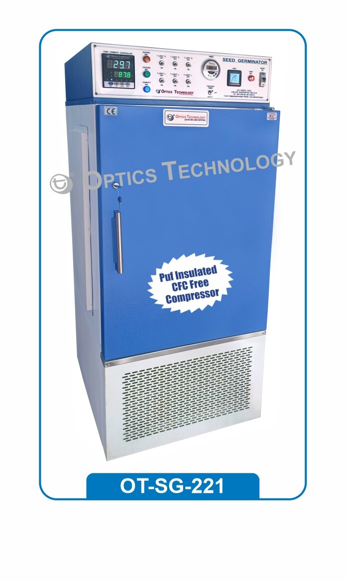 Most suitable for conducting various experiments on a variety of seeds under different conditions of temperature and humidity. Atmospheric conditions are created within the chamber. Double walled unit Inner chamber made of Stainless Steel and outer chamber of M.S. sheet duly painted & controlled by Digital Temperature controller-cum-Humidity Controller. Humidity is created in a S.S. water reservoir fitted at the bottom to provide RH Humidity Supplied complete with 12-14 adjustable wiremesh trays with Exterior lighting arrangement on both sides. Specification Temperature range : 5°C to 50°C Temperature Accuracy : ± 1°C RH Humidity : 90% to 95% ± 3% Power Supply : 220/230 volts A.C. Supply. Inside Chamber Size: (W x D x H) 600 x 600 x 900 mm (24“ x 24” x 36') Optional : Automatic Cyclic Timer (0-24 hours) Dual Setting Digital Temperature Controller for setting two different temperatures for day and night. Automatic Voltage Stabilizer 3 KVA. Microprocessor Based Touch Screen Display System