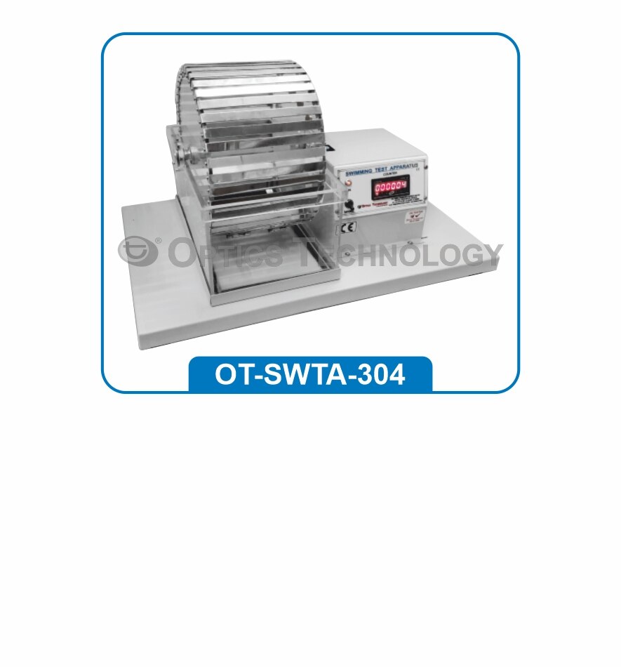 The locomotor activity can be easily measured using SWIMMING TEST APPARATUS which consists of clear perspex rotating drum with ribs in a clear perspex tank and Digital counter with resetting facility to count the activity of the animal. Both rats and mice may be used for testing in this apparatus. This Apparatus consists of ONE DRUM and perspex tank as described above for testing. Optional : Digital Timer