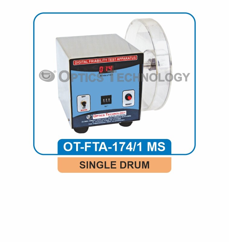 The apparatus is designed to determine the abrasion rate and impact hardness of tablets. One/Two transparent acrylic drums rotated by superior quality constant speed sturdy motor, mounted in painted sheet metal cabinet with chemical resistant epoxy coating. (Body is made of M.S. Duly Powder Coated / S.S. 304). Special Features: Realistic abrasion rate is obtained by pre-set revolutions through a pilot lamp as compared to time setting, where voltage fluctuation may change number of revolution in pre-set time. Specification: Drum Diameter : 285mm Tablet Fall Distance : 140mm Drive : 1/8 HP Power : 230 V AC Single Phase