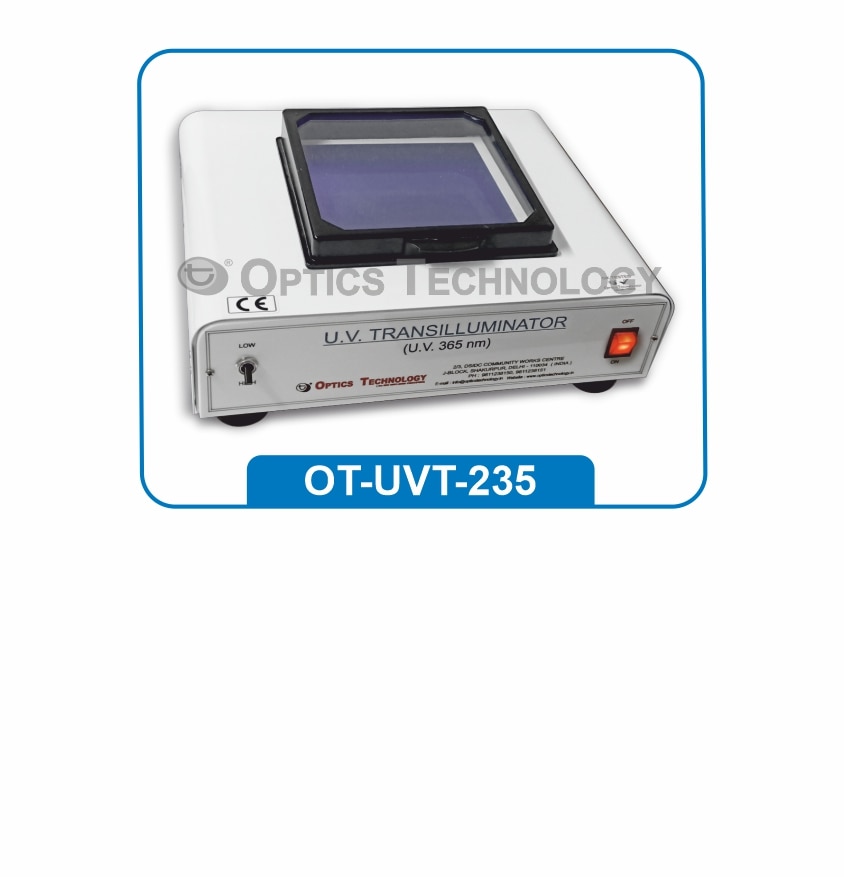 Transilluminators find wide applications for DNA analysis. All models have high output UV tubes, which have an average life expectancy of 5000 hours. The UV filters are polished to give blemish free viewing of the gel. College Model Transilluminator with Filter: Wavelength : 365nm Fixed No. of : Tubes 6 Wattage : 8 Watts Detection limit : 200 ng Filter area : 20X20 cm Body : MS Duly Powder Coated