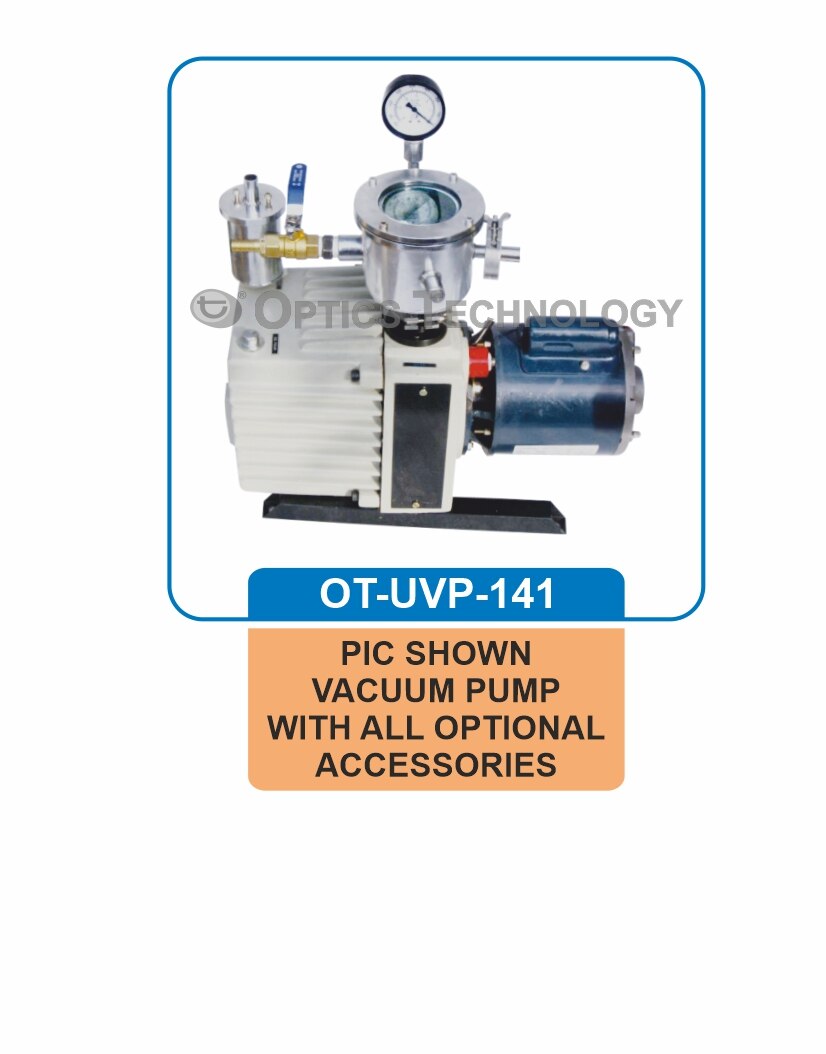 TWO-STAGE VANE PUMP To improve the backing pressure and displacement at low pressure two stages are connected in series. ANTI-SUCKBACK SYSTEM If the Power Supply fails on stops, an anti-suck back device. Prevents air or oil the pump to be drawn back into the chamber being evacuated and operated by Solenoid coil. GAS BALLAST The gas ballast allows a quantity of air to be injected into the second stage of the pump during compression to reduce the partial pressure to the pumped gas below its saturated Vapour pressure and thus prevent condensation. The saturated vapour pressure of a gas is higher when it is hot and lower when it is cold. When gas ballasting is in use, there will be increase in ultimate pressure of the pump as well as the temperature. Power : 230V AC supply Optional: Moisture Trap Non Return Valve Vacuum Gauge Air Oil Mist Exhaust Filter