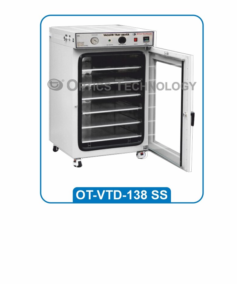 Vacuum Tray Dryer used in various industries under vacuum atmosphere to dry temperature sensitive materials. It gives complete drying and vaporization of moisture of the product. Inside Chamber made of S.S. (304) & Outer Mild steel duly powder coated / S.S. Temperature controlled by Microprocessor based PID Controller, Temp. Stability ±1ºC, Temperature Range 50ºC to 130ºC. It Fitted with Vacuum Release Valve, with Toughened Glass Door, Provided with S.S. Tray. Tray size 16” x 32”. Optional: Digital Vacuum Gauge Microprocessor Based Touch Screen Display System with Data Logging Vacuum Pump with Oil & Belt Motor System Vacuum Gauge Moisture Trap Non-Return Valve NOTE: Without Vacuum Pump.